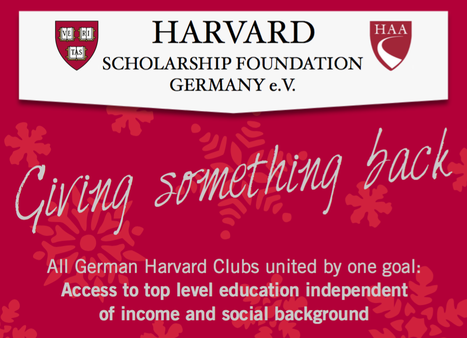 Die fünf deutschen Harvard Clubs haben gemeinsam die Harvard Scholarship Foundation Germany e.V. gegründet, die mit gebündelten Kräften fähige junge Menschen unterstützt, für die das Studium in Harvard aus sozioökonomischen Gründen nicht möglich wäre.